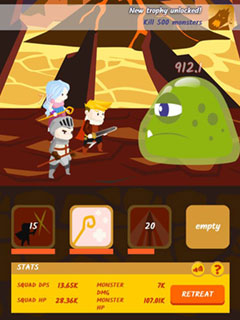 Brave Squad is an highly addictive endless game in the tradition of Cookie Clicker. The premise of the game is really simple: Alone or with your party you have to fight increasingly strong monsters. The gold you earn for slaying said monsters can be invested in upgrading your heroes, unlocking new party members or in hiring workers that earn you money even when you are not playing. But you will be playing. A lot. Just like with Cookie Clicker you go for one more upgrade, one more achievement. And then one more and suddenly a new day dawns and you are not quite sure how this happened.Play Brave Squad now for free! Are you able to unlock all the achievements?